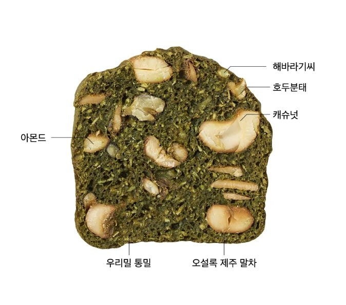Crunch into wholesome flavor with OSULLOC Matcha Biscotti Chip, a high-protein, green tea-infused snack made with Korean whole wheat and a mix of nuts for satisfying texture and balanced nutrition.