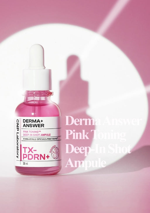 CNP Derma+ Answer Pink Toning Deep-In Shot Ampule is a “pink lighting” brightening essence designed to refine skin tone, fade dark pores and post-acne marks, and deliver deep hydration using micro spicules and PDRN for enhanced absorption.
