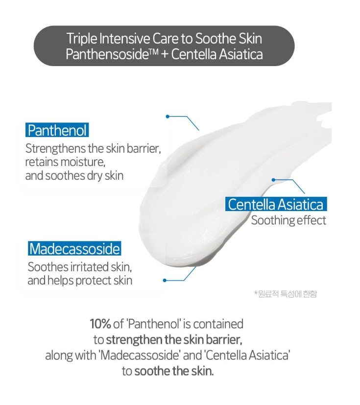 - Panthensoside: A stabilized blend of panthenol and madecassoside to strengthen the skin barrier and accelerate recovery.