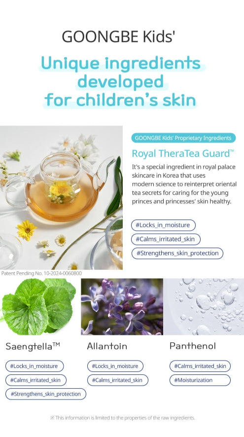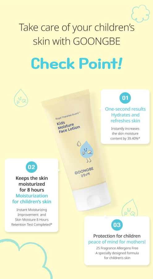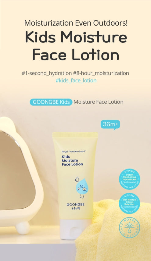 GOONGBE Kids Moisture Body Lotion 250ml + Moisture Face Lotion 80ml is a gentle Korean moisturizing duo formulated to deliver instant, long-lasting hydration for children's sensitive and rough skin. Designed to absorb quickly for "1-second" hydration and to maintain moisture for up to 24 hours, this pairing helps soften and smooth rough texture while supporting everyday skin comfort for toddlers and young children.