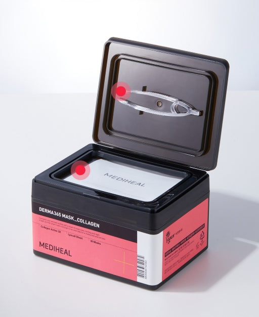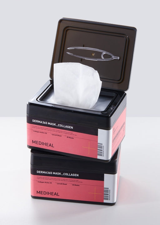 MEDIHEAL Derma 365 Collagen Mask is a Korean daily sheet mask formulated to firm, hydrate, and revitalize skin. Infused with a Collagen Active 3X complex, this 30‑sheet pack offers convenience for everyday masking while delivering moisturizing, lifting care.