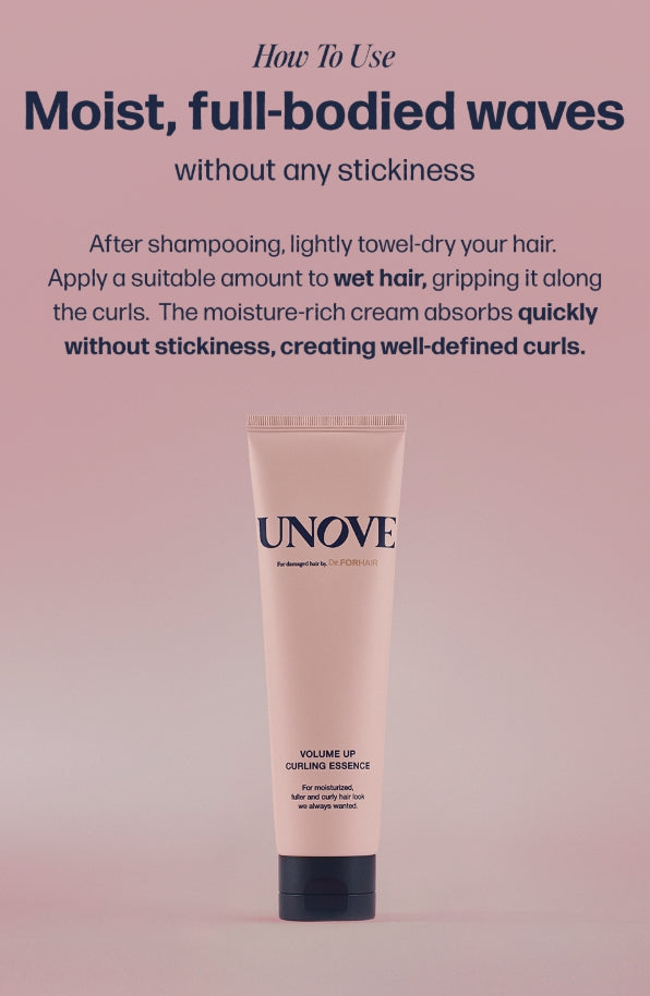 UNOVE Volume Up Curling Essence is a Korean hair treatment designed to create moist, natural-looking curls with a soft hold and rich hydration. Formulated as an essence, it delivers 36 types of proteins and nutrients to nourish and strengthen hair while enhancing curl definition and volume. The lightweight, non-sticky texture smooths frizz and boosts bounce without weighing hair down, finished with a Tender Bloom fresh floral musk fragrance highlighted by bright orange top notes for a refined, long-lasting scent.