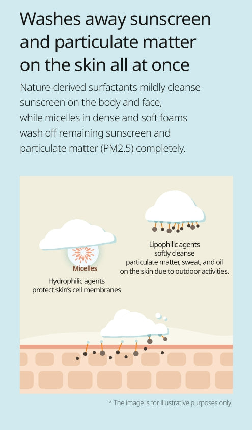 - Natürliche Tenside reinigen Sonnenschutzmittel auf Körper und Gesicht schonend, während Mizellen in dichten und weichen Schäumen restliche Sonnenschutzmittel und Partikel (PM2,5) vollständig abwaschen.