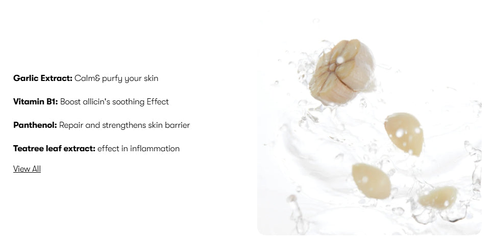 - Garlic Exosome + Allicin Complex: Formulated to deliver antibacterial and calming support to blemish‑prone areas, helping reduce redness and visible breakouts.