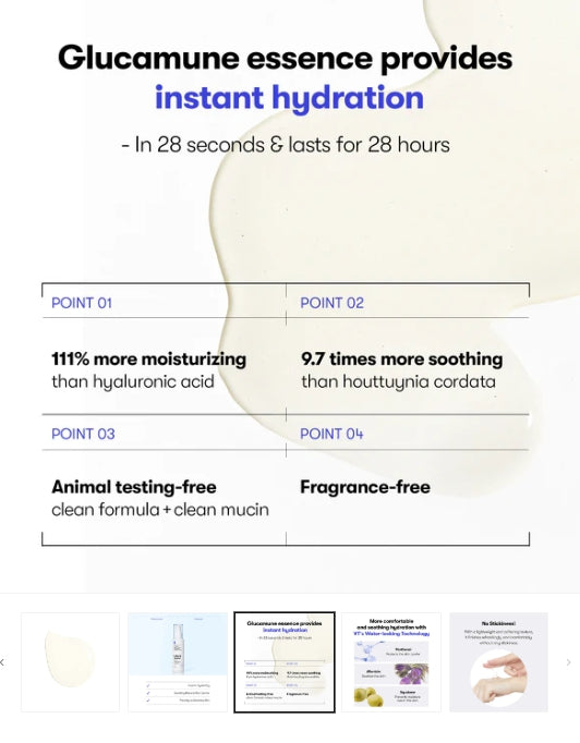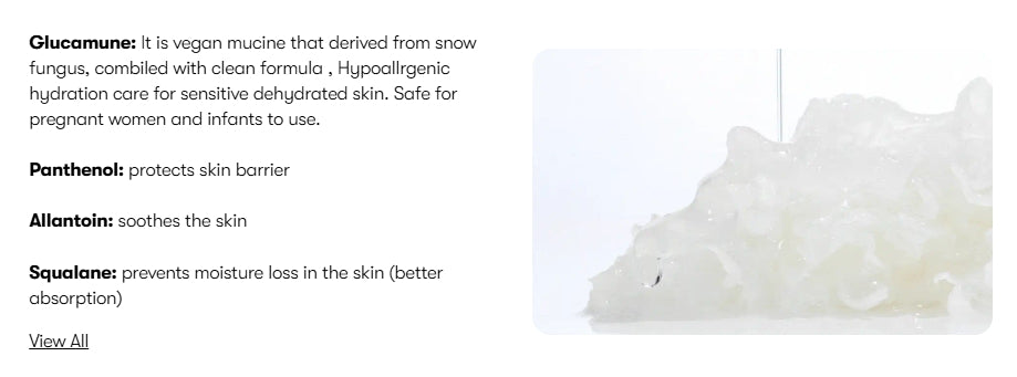 - Glucamune™ Complex: Contains a plant‑based mucin extracted from snowy‑fungus (Tremella fuciformis) that offers advanced hydration and barrier support.