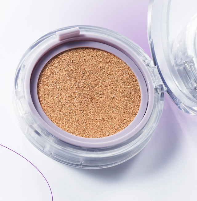 - Press the puff gently into the cushion to pick up product, then lightly tap onto the face starting from the center and blending outward. Layer for desired coverage.