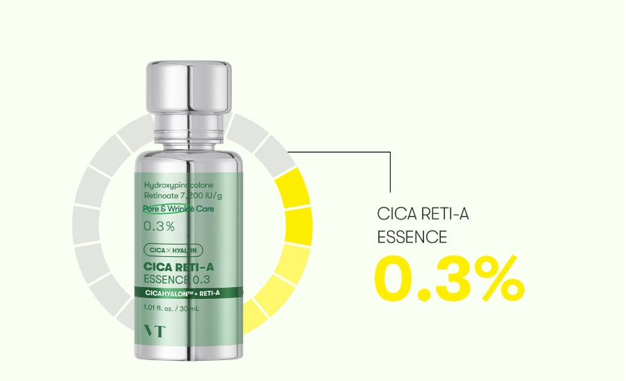VT COSMETICS Cica Reti‑A Essence is a Korean premium anti‑ageing essence formulated with gentle retinol derivatives including Hydroxypinacolone Retinoate and pure Retinol, blended with a CICA HYALON™ complex (Centella Asiatica + multiple Hyaluronic Acids) to refine skin texture, reduce visible pores and support a smoother, more resilient complexion.
