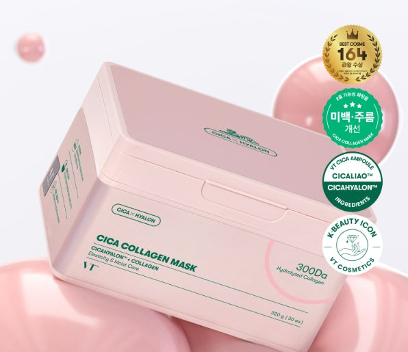 VT COSMETICS Cica Collagen Mask 30‑sheet pack delivers intense hydration, firming, and soothing care with low‑molecular collagen, CICA, and multi‑layer hyaluronic acid, leaving skin plump, calm, and revitalised.