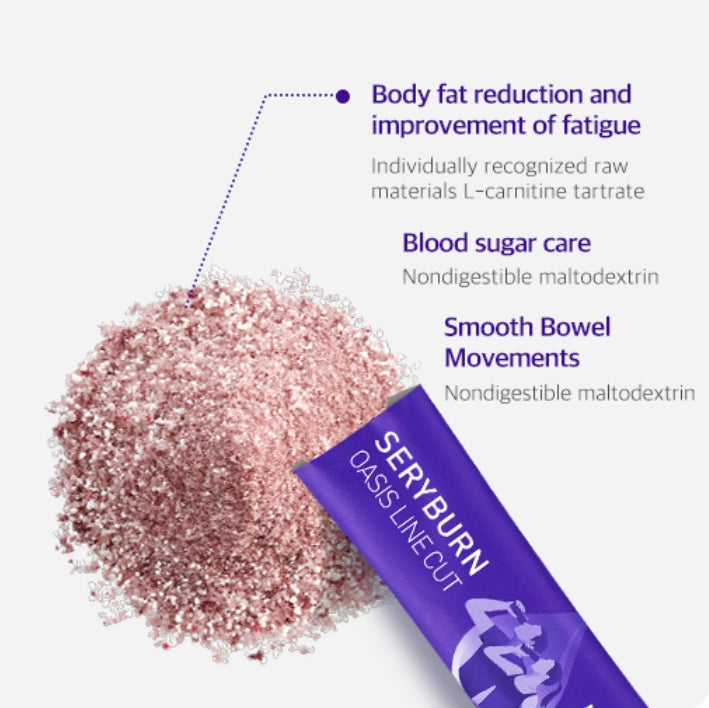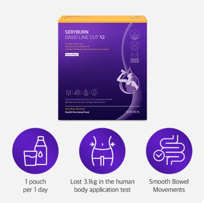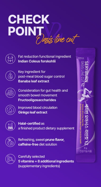 SERYBURN Oasis Line‑Cut V2 Diet is a Korean functional dietary supplement designed for effective weight management and digestive support. Packaged in daily powder sticks (8 g × 28), this all‑in‑one solution helps reduce body fat after heavy meals, supports gut health, controls postprandial blood sugar, and promotes circulation. Halal-certified, GMP-certified, and manufactured in Korea for global distribution.