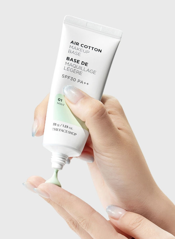 THE FACE SHOP Air Cotton Makeup Base is a lightweight color‑correcting primer infused with cotton extract and niacinamide, designed to neutralize redness while delivering SPF 30 PA++ protection. Its airy texture helps create a smooth, even canvas for foundation.