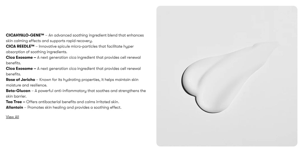 - CICAHYALO‑GENE™ Calming Complex: Combines Centella Asiatica derivatives, Cica Exosomes, Tea Tree Leaf Extract and Beta‑Glucan to soothe skin and reinforce barrier function.