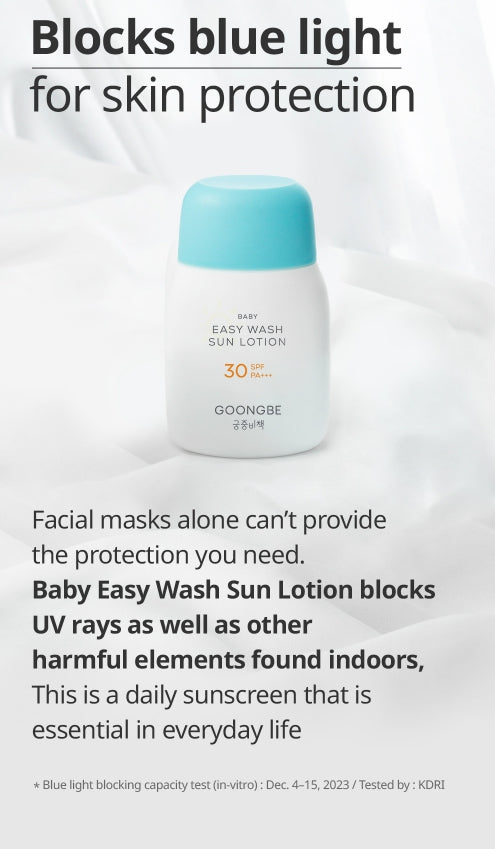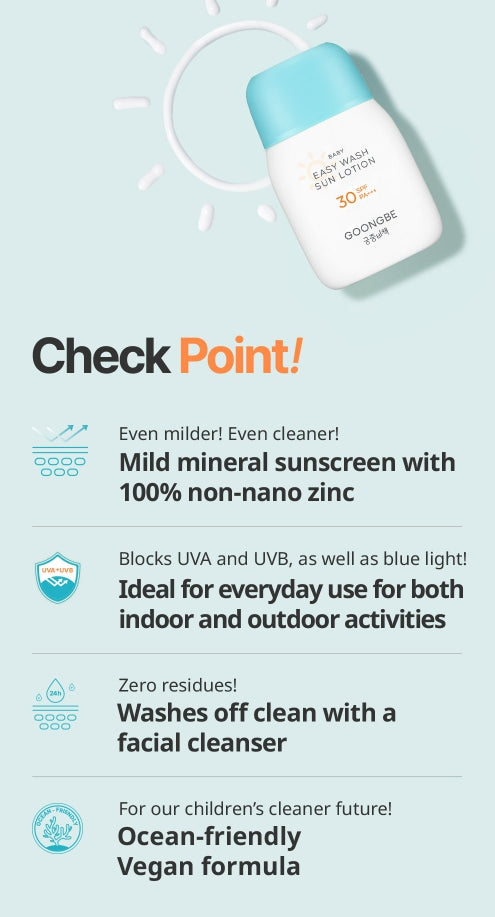GOONGBE Easy Wash Sun Lotion is a mild, mineral-based sunscreen formulated with Moisture Matrix technology to keep skin hydrated throughout the day while providing reliable protection from UVA, UVB and blue light. Featuring 100% non-nano zinc oxide, this lightweight lotion is designed for everyday indoor and outdoor use, rinses off cleanly with no sticky residue, and is suitable for sensitive skin types that prefer gentler sun care.