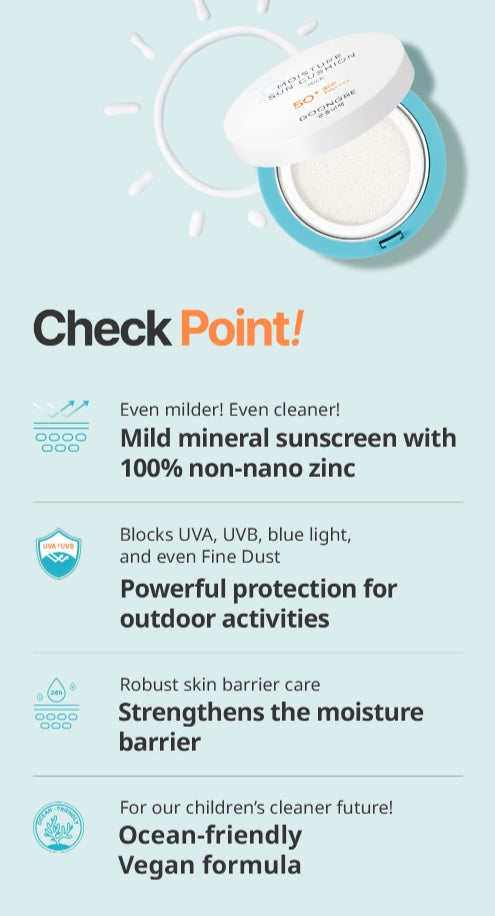 GOONGBE Moisture Sun Cushion Mild is a moisturizing, mineral-based sun cushion from Korea designed for daily broad-spectrum protection and gentle skin care. Formulated with 100% non-nano zinc oxide, this cushion blocks UVA and UVB rays while helping reduce exposure to blue light and fine dust; its hydrating cushion format supports the skin’s moisture barrier and provides a light, buildable coverage suitable for sensitive skin and children's use. The convenient compact delivers easy reapplication on the go and comes as a twin pack for extended daily use.