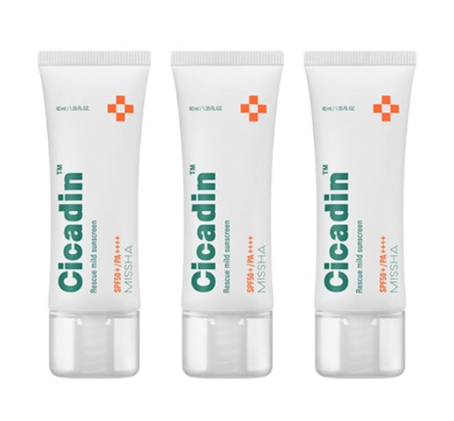 MISSHA Cicadin Rescue Mild Sun Cream SPF50+ PA++++ is a gentle, high-protection sunscreen formulated for sensitive and irritated skin, combining broad-spectrum UV defense with soothing care; it contains 42% of six different types of Centella Asiatica for calming and barrier support, a 100% non-nano UV filter system for safer daily use, and a triple-layer heat protection technology to guard skin from environmental stressors while providing a lightweight, non-greasy finish—this listing includes a convenient 3-pack of 40ml tubes shipped from Korea.