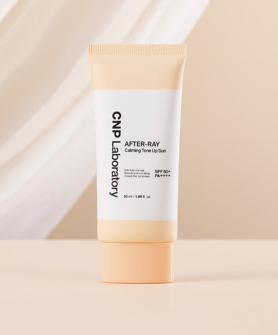 CNP AFTER-RAY Calming Tone-Up Sun is a mineral-based daily sunscreen with SPF 50+ and PA++++. It delivers instant tone-up with a light beige tint and a silky “silk filter” texture, providing a luminous, non-chalky finish while soothing sensitive or irritated skin.