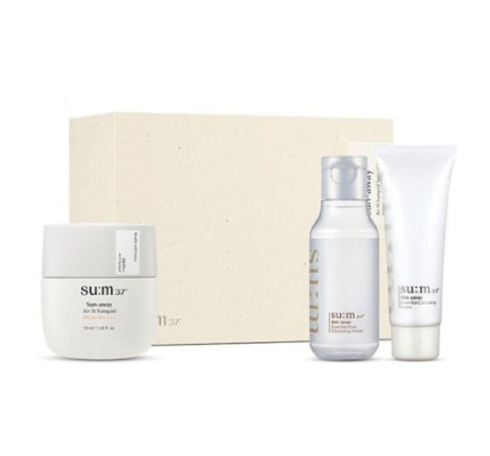 Experience comprehensive sun protection with the Su:m37 Sun-away Air Fit Sunquid Special Set—featuring a lightweight, breathable sunscreen and essential cleansing duo for daily skincare.