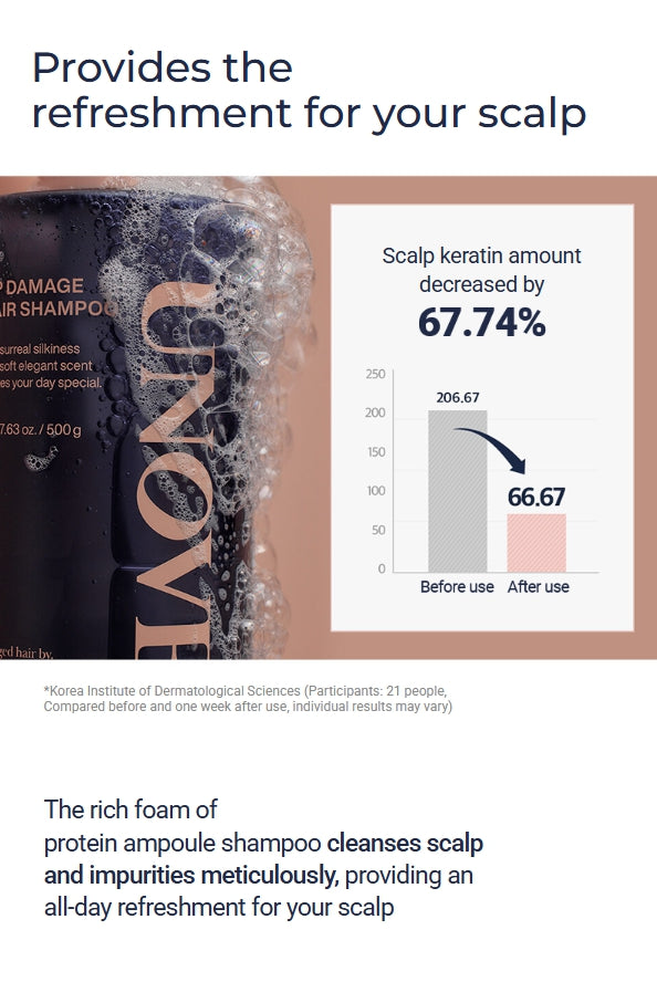 UNOVE Deep Damage Repair Shampoo is a professional-grade Korean hair treatment formulated to restore strength and softness to damaged hair while keeping the scalp refreshed. Designed for daily use, this low-irritation shampoo removes keratin build-up and delivers 35 types of premium proteins and nutrients to replenish strands weakened by heat, chemical services, or environmental stress. The lightweight lather detangles without weighing hair down and features a refined professional fragrance for a salon-fresh finish.