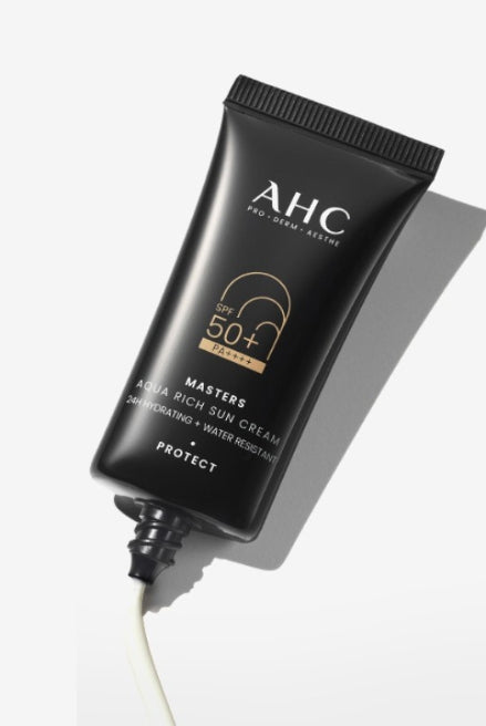 Protect your skin with AHC Masters Aqua Rich Sun Cream SPF50+ PA++++, offering long-lasting hydration and broad-spectrum UV defense in a lightweight formula.
