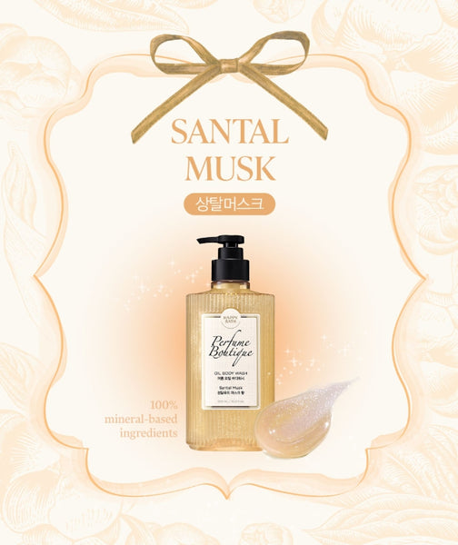 Overview — Experience long-lasting, perfume-inspired care with the HAPPY BATH Perfume Boutique Oil Body Wash in Santal Musk. This richly fragranced oil-body wash blends top notes of orange with floral heart notes of jasmine, muguet and ylang-ylang, and a warm base of sandalwood, vanilla and amber to leave skin delicately scented. Formulated with 100% mineral-derived ingredients, it gently cleanses while helping skin look radiant and glowing, turning your daily shower into a moisturizing, sensory experience. Ideal for those who want a lasting fragrance finish without compromising skin hydration.