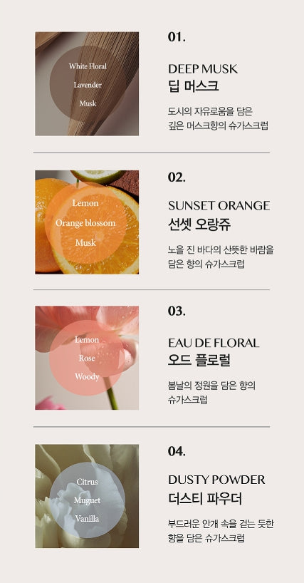 HAPPY BATH Skin U Innoscent (Eau De Floral) Scrub delivers gentle yet effective exfoliation with a blend of AHA & BHA, micro sugar and real sugar particles to smooth skin and reveal a softer, brighter complexion. Enriched with vitamin E and amino acids, this 3-step exfoliating care uses three particle sizes for targeted removal of dead skin cells while maintaining skin balance. Clinically recognized with Germany Derma Test "Excellent" and formulated without 12 problematic additives, the scrub provides a long-lasting floral scent and a comfortable, non-irritating finish suitable for regular use on body skin.