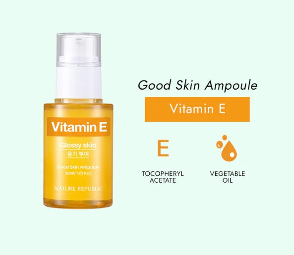 The NATURE REPUBLIC Good Skin Ampoule (Vitamin E) is a budget-friendly Korean serum designed to nourish and boost skin radiance with a lightweight, oil-infused formula; enriched with Vitamin E, Vitamin B5 (panthenol), and sunflower seed oil, it delivers lasting moisture, helps smooth the skin’s texture, and layers easily under moisturizers or makeup for a healthy glow — this listing features a two-pack of 30ml ampoules for value and everyday use.