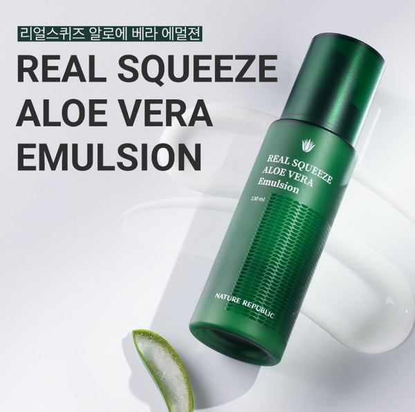 NATURE REPUBLIC Real Squeeze Aloe Vera Emulsion is a lightweight, non-greasy moisturizer formulated with aloe vera extract sourced from California to soothe, hydrate, and improve skin texture. Designed for daily use, this emulsion provides immediate moisture without stickiness, leaving skin supple and smooth while layering easily under makeup or other skincare steps. This listing contains two 130ml bottles ideal for home use or travel-ready skincare routines.