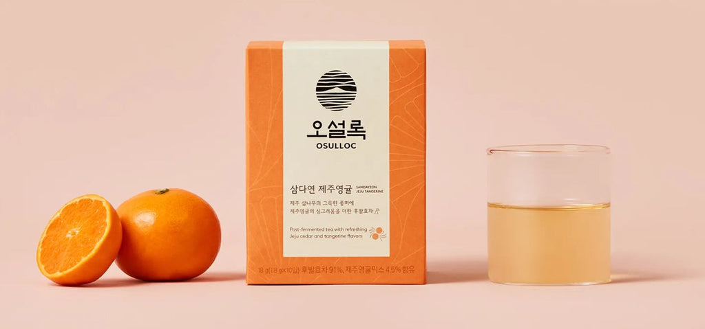 Immerse yourself in the vibrant aroma of Jeju with OSULLOC Samdayeon Jeju Tangerine Tea, a refined post-fermented blend matured in cedar barrels for a crisp, citrus finish.
