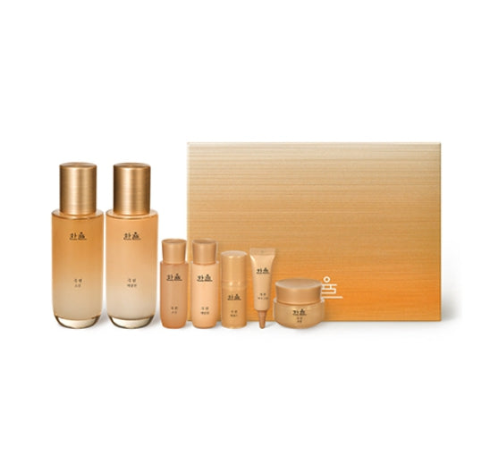 HANYUL Extreme Ginseng The Classic Skin·Emulsion Set (7 items) delivers a concentrated Korean ginseng anti-aging regimen designed to restore elasticity, boost collagen support, and infuse deep nutrition for mature or dry skin. Formulated around a ginseng collagen complex, this premium set combines skin-fortifying toners, emulsion, and a rich ginseng collagen cream to smooth fine lines, improve firmness, and leave skin with a nourished, resilient texture. Ideal for a complete daily routine, the set focuses on wrinkle elasticity, moisture retention, and visible texture refinement using traditional Korean ginseng ingredients and modern skin science.