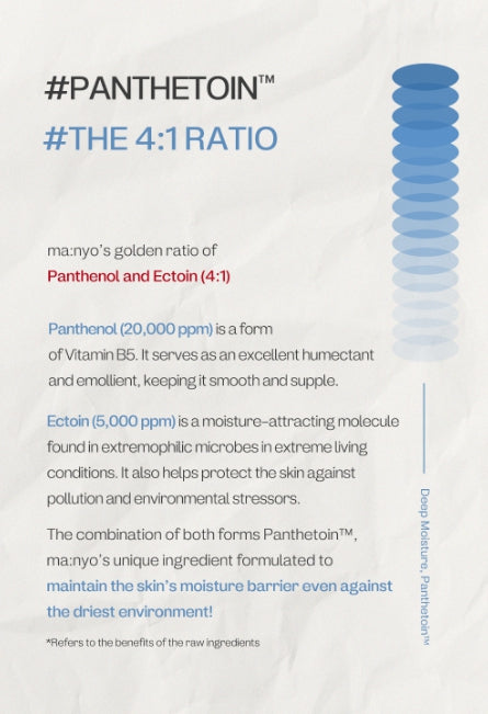 - Panthetoin 4:1 Formula: Combines Panthenol and Ectoin at ma:nyo's golden ratio to support skin repair and resilience.