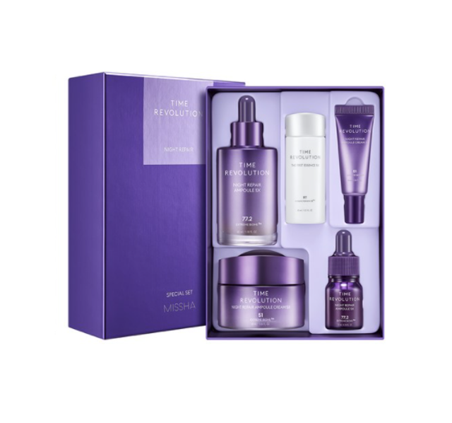 The MISSHA Time Revolution Night Repair 5X Set is a targeted Korean night-time skincare regimen designed to restore radiance, improve firmness, and boost hydration while you sleep; the kit combines concentrated Night Repair Ampoules and creams with The First Essence to accelerate skin renewal, reduce visible signs of aging, and strengthen the skin barrier using fermented and bioactive ingredients for smoother, more even, resilient skin by morning.