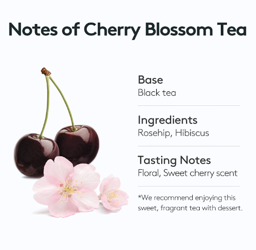 - Cherry Blossom Aroma: A romantic tea blend that opens with the subtle scent of cherry blossoms and finishes with sweet cherry and tangy pineapple notes.